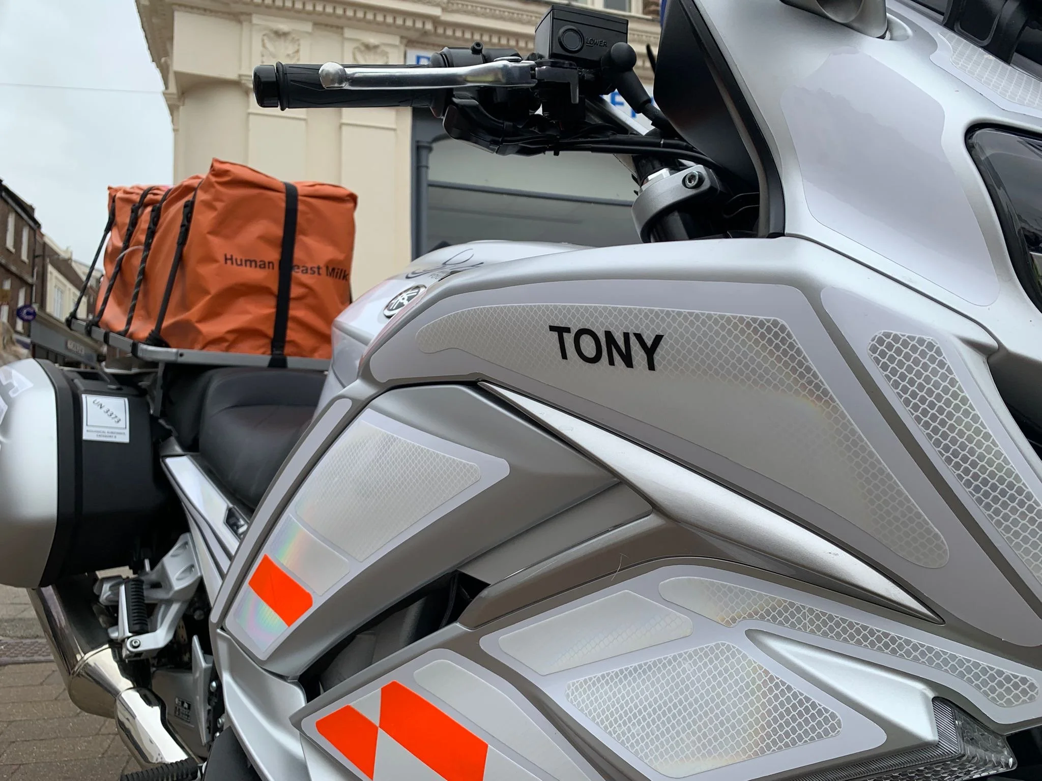 Rather than our usual hi-vis yellow and orange, we chose to use hi-vis white and orange over the matte silver of the orginal paint finish. We also wanted to raise awareness of the work the charity does with the Human Milk Foundation and Hearts Milk Bank.